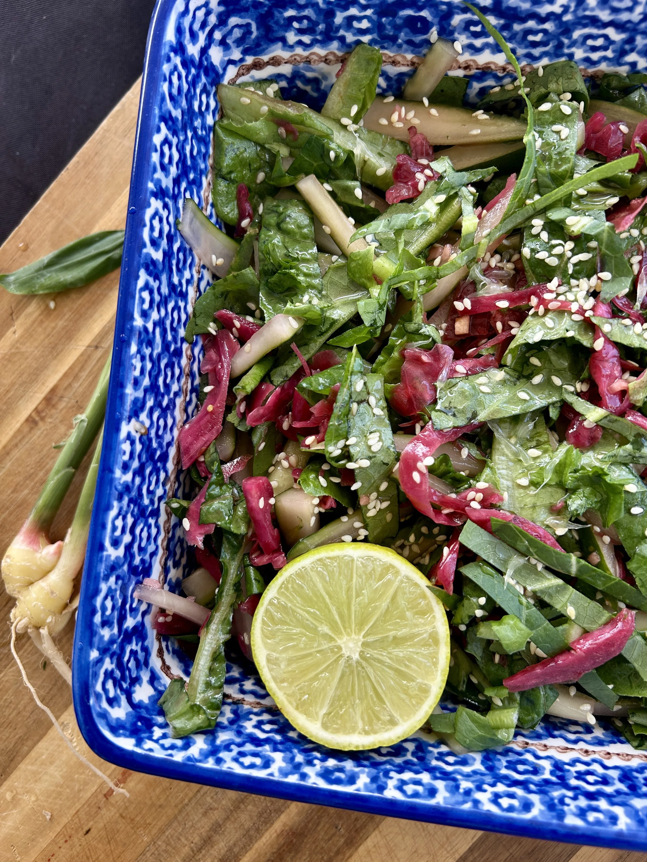 Make the dressing: In a small bowl, whisk together the kraut brine, minced ginger, soy sauce, honey, sesame oil, and lime juice. Taste and adjust seasoning if needed.