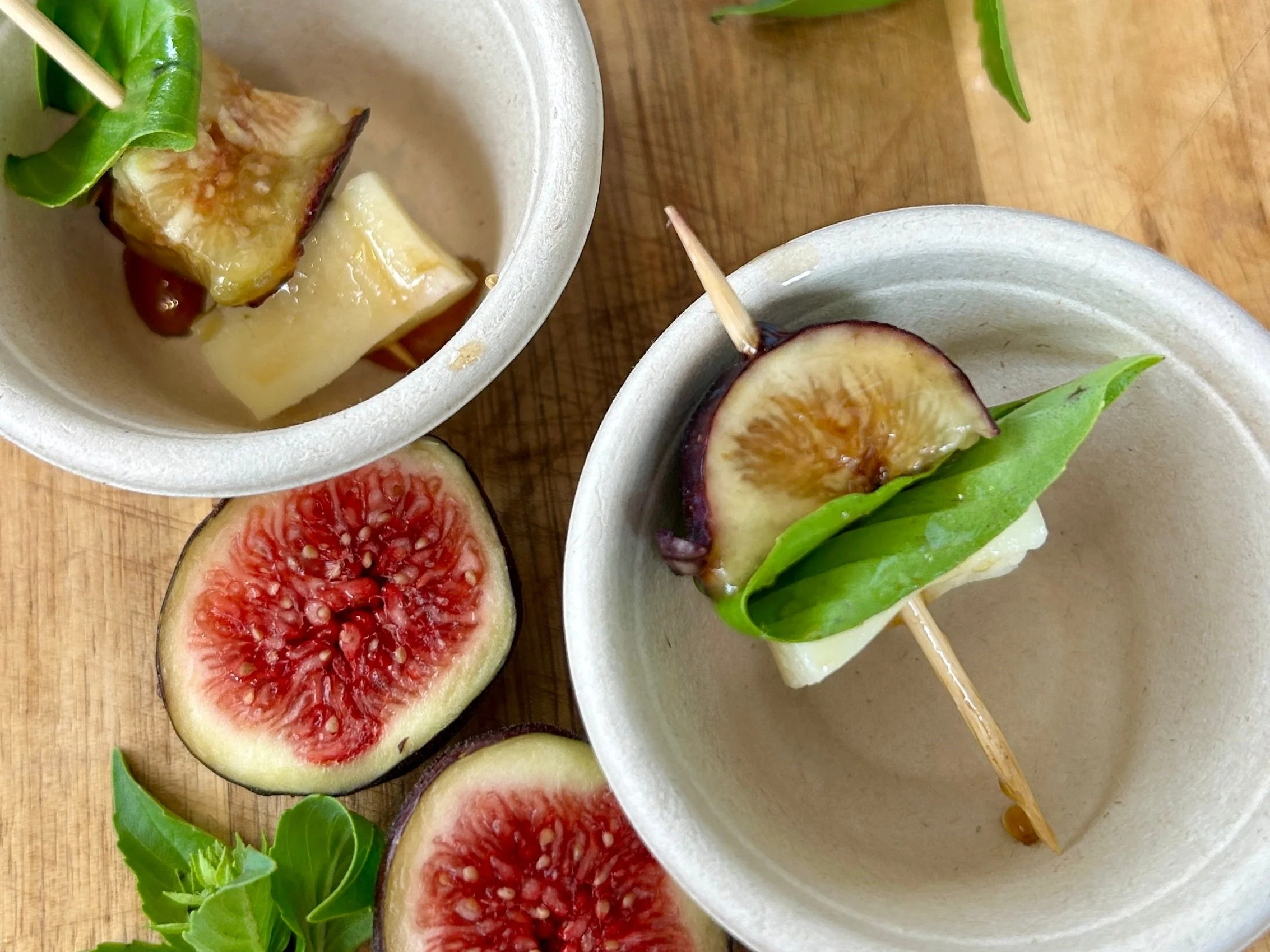 On each toothpick or small skewer, thread a cube of cheese, fold and add a basil leaf, then finish with a fig piece.