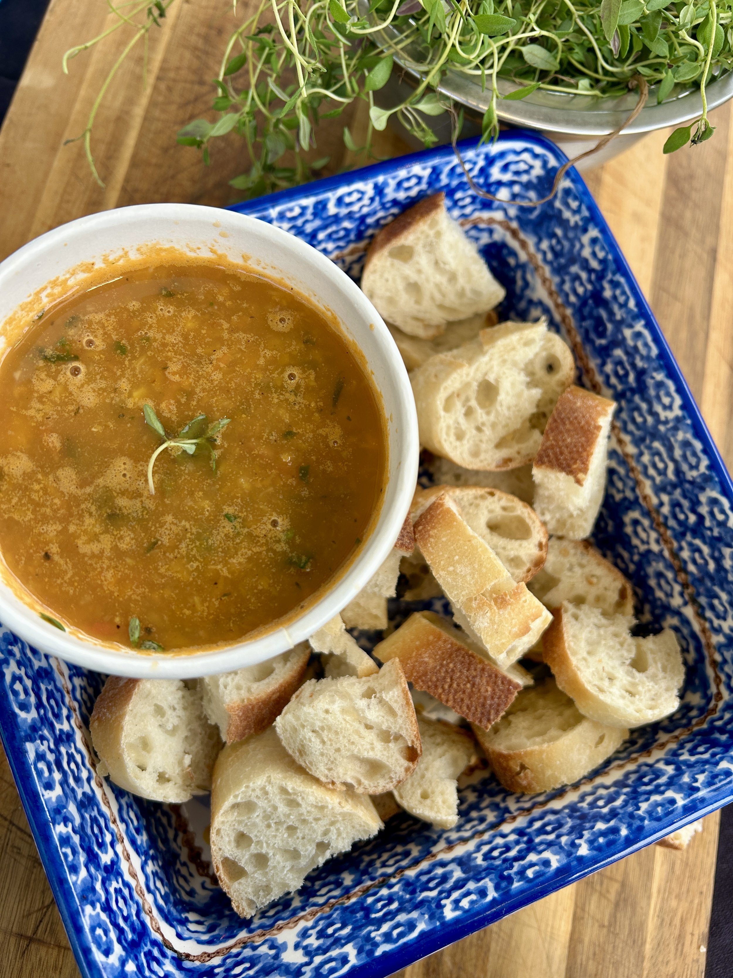 Serve— Taste and adjust seasoning as needed. Serve with sliced and toasted baguette.